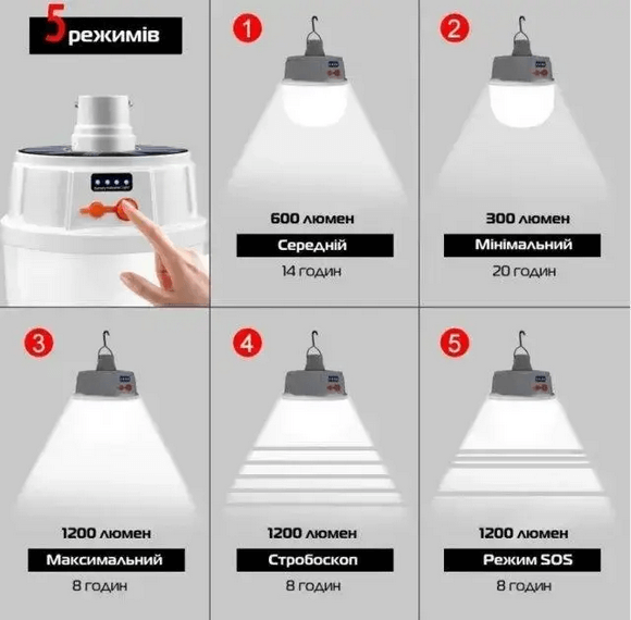 Цей світильник має 5 режимів освітлення. Поставляється з гачком із нержавіючої сталі, що дозволяє підвісити лампу в будь-якому місці, яке ви хочете.